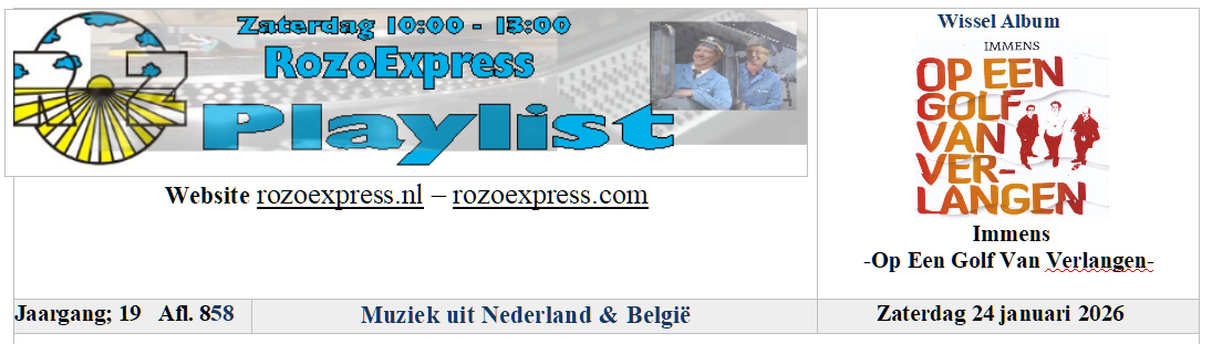 Zaterdag 24 januari – Op een golf van verlangen is de titel van het in eigen beheer uitgebrachte album van Immens. Immens is een Nederlandstalige band uit Den Haag met zelfgeschreven repertoire. Ze omschrijven hun genre als Nederlandstalige pop met invloeden van kleinkunst en rock. In deze uitzending hebben wij deze week uiteraard weer de nodige nieuwe muziek, om precies te zijn 8. Natuurlijk ook weer 3 nummers van Rob de Nijs met nummers uit de jaren 70, 80 en 90. Voor onze XXL-track kun je gerust wel even gaan zitten, omdat deze maar liefst 10 munuten duurt. Een klein overzicht van wat we allemaal gaan draaien. We zijn er weer live bij, dus kun je ook weer tijdens onze uitzending weer met ons chatten.